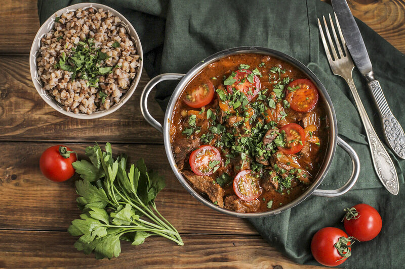 - Добавьте кусочки говядины и влейте бульон. Доведите до кипения, затем убавьте огонь до низкого и тушите 20-25 минут. В отдельной кастрюле доведите 350 мл воды до кипения, посолите и засыпьте гречку. Варите на слабом огне под крышкой 7-10 минут, пока вода не впитается. Если гречка ещё не готова, добавьте немного кипятка и держите под крышкой ещё несколько минут. Готовую гречку смешайте с сливочным маслом.