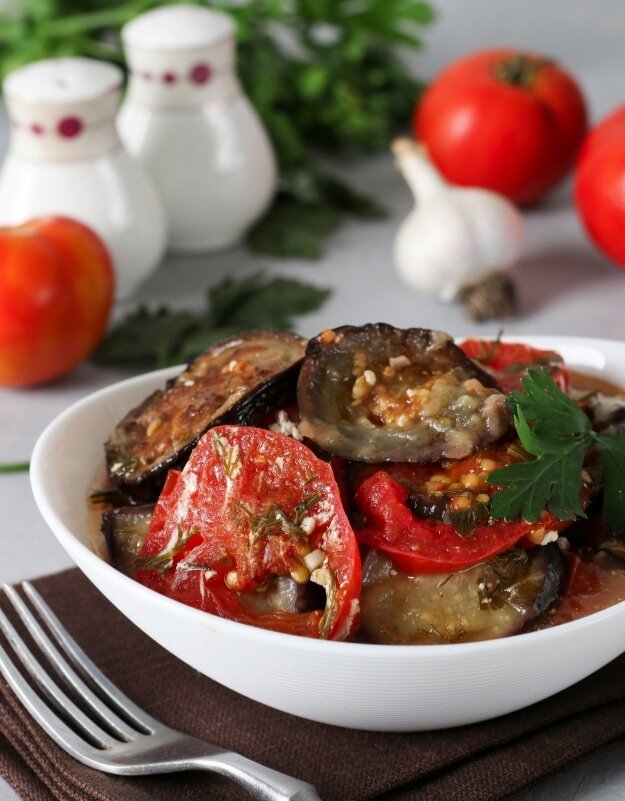 На дно подходящей кастрюли выложить слой обжаренных баклажанов, затем помидоры, посолить, поперчить и посыпать зеленью и чесноком. Повторять слои, пока все ингредиенты не будут использованы.