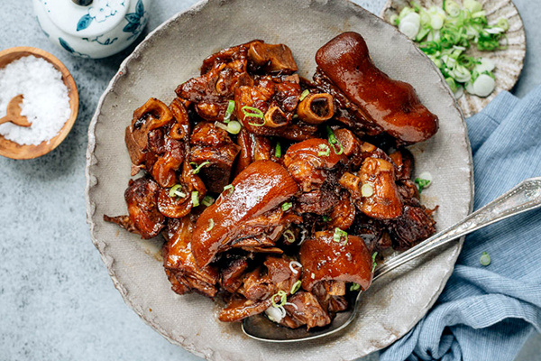 Хун Шао обозначает классическую технику китайского тушения, где мясо медленно пропитывается вкусами в смеси соевого соуса, вина, сахара и специй. Это делает свиные ножки идеальным кандидатом: они полны коллагена и желатина, благодаря чему при правильной термической обработке превращаются в невероятно мягкое и сочное блюдо.