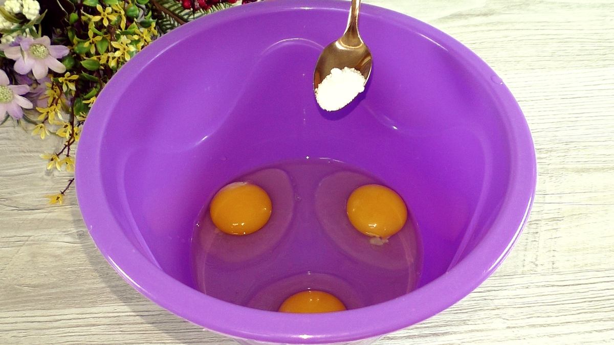 В глубокую миску помещаются яйца, сахар и соль. Количество соли зависит от солёности колбасы и сыра, поэтому её лучше добавлять на глаз. Сахар, в свою очередь, создаёт баланс вкуса, поэтому его использование обязательно.