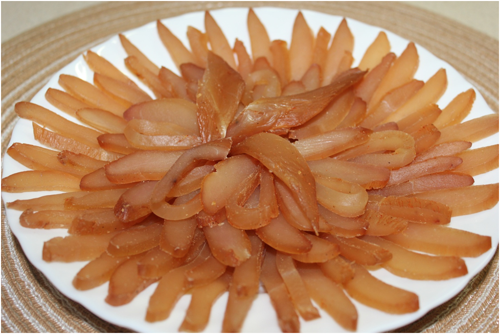 4. Последним этапом является подвешивание филе в хорошо проветриваемом помещении на 1-2 дня. Можно использовать веревочки или деревянные шпажки. Если специи добавляются после засолки, их следует нанести на обсушенное филе перед вялением. Малую часть филе можно использовать, так как она готовится быстрее.