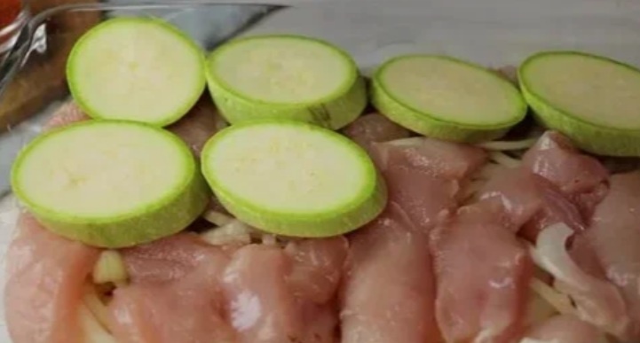 - В форму выкладываем половину кабачков, затем мясо.