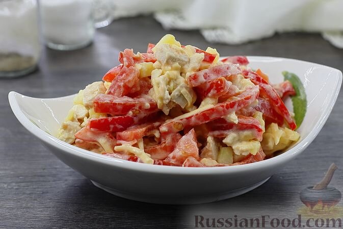 Первым в списке является салат, в основе которого лежит куриное мясо, овощи и сыр. Каждый ингредиент в этом блюде словно создан, чтобы дополнять другой, создавая настоящую симфонию вкусов. Подавая такой салат, можно не переживать за сытость гостей.