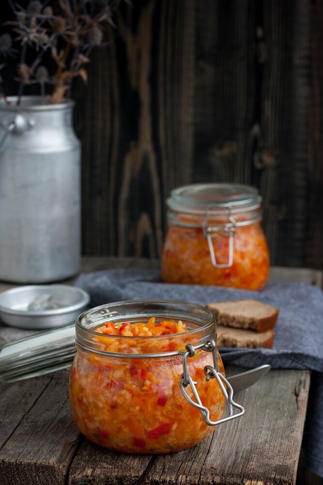 Готовую закуску разложите по банкам и закройте их на зиму. Она отлично подойдет как с хлебом, так и в качестве добавки к основным блюдам.