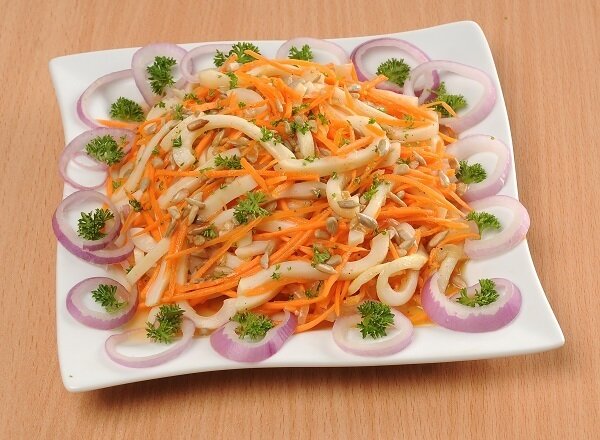 В глубокой миске соединяются кальмары, морковь, соль и уксус, все хорошо перемешивается. Затем добавляется чеснок и молотый перец. После этого нужно залить массу горячим растительным маслом, в которое был обжарен лук. Хорошо перемешать смесь и поставить в холодильник на полчаса.
