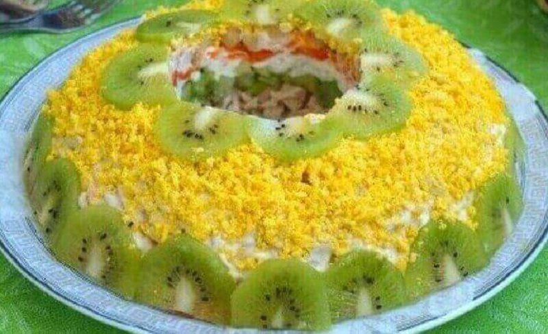 Салат собирается на плоском блюде или сервировочной тарелке с использованием цилиндрического стакана в центре. Каждый слой будет промазываться небольшим количеством майонеза. В первую очередь укладывается половина куриного филе, затем слой киви, после — измельченные белки, морковь и яблоко, снова филе и финальный слой тертого сыра. Сверху посыпаем измельченными желтками и украшаем ломтиками киви. Для более полезного варианта майонез можно заменить натуральным йогуртом.