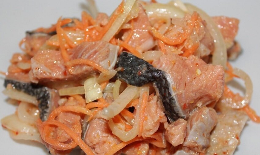 Филе рыбы тщательно вымыть и обсушить с помощью бумажного полотенца. Затем нарезать его небольшими полосками и обсыпать сахаром, добавить соль, уксус, молотый перец и немного специй. Все тщательно перемешать, накрыть пленкой и оставить в холодильнике на 8–10 часов для мариновки. Рекомендуется готовить салат с вечера, чтобы он успел настояться.