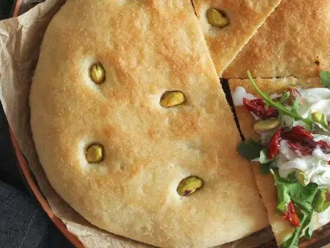 После этого тесто помещают в теплое место, накрывают и оставляют подходить на 30-40 минут. Когда тесто увеличится в объеме, его обминают и формируют лепёшку толщиной примерно 2 см. Для украшения и дополнительного вкуса в тесто втыкаются фисташки, а затем на поверхность капается ароматное масло, что придаёт фокачче неповторимый аромат при выпекании.
