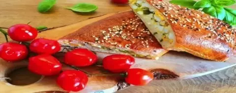Сначала творог смешивается с мукой, псиллиумом, солью и белком яйца. Затем начинка из вареных яиц и зелени выкладывается на раскатанное тесто, которое сворачивается в рулет. После смазки желтком и выпекания в духовке рулет становится румяным и аппетитным.