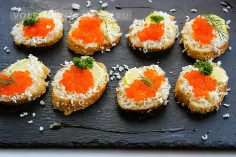 Разложить ломтики багета, нанести тонкий слой масла, сверху выложить дольку лимона и чайной ложкой — икру.