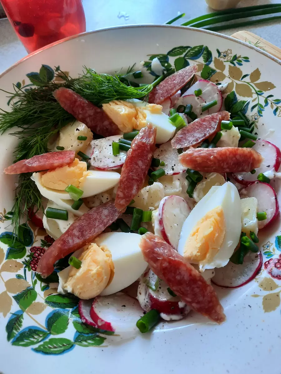 Для любителей салатов представлен новый аппетитный рецепт. Этот вариант станет отличным дополнением для теплого летнего вечера. Сочетание яиц и слегка острых подкопченных охотничьих колбасок придает блюду уникальный и замечательный вкус, а также делает его довольно сытным. Такой салат легко подать как легкий ужин.