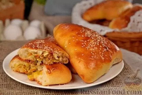 Не забудьте попробовать дрожжевые пирожки с капустой и яйцами, которые готовятся на основе кефира. Сочного фарша с капустой, обжаренной с морковью и луком, будет достаточно, чтобы порадовать всех домашних. Перед выпечкой их стоит смазать желтком и присыпать кунжутом для золотистой корочки.