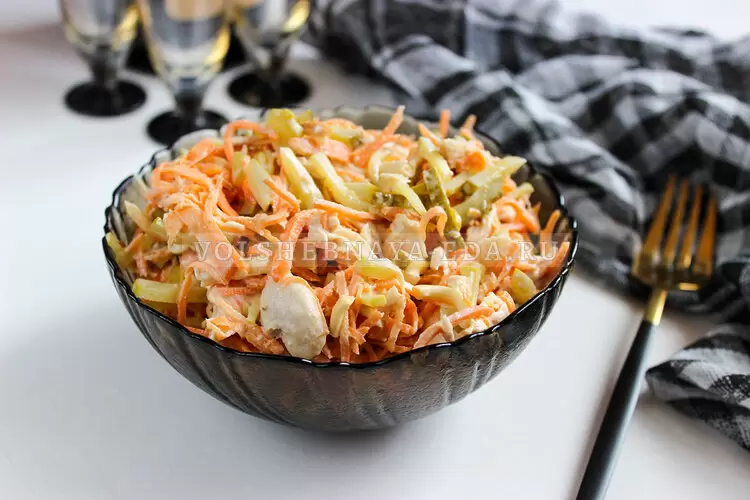 Компоненты салата включают отварное куриное филе, маринованные огурцы, морковь по-корейски и сыр, заправленный нежным майонезом. Чтобы раскрыть все ароматы, следует дать салату немного настояться в холодильнике перед подачей, хотя бы полчаса.