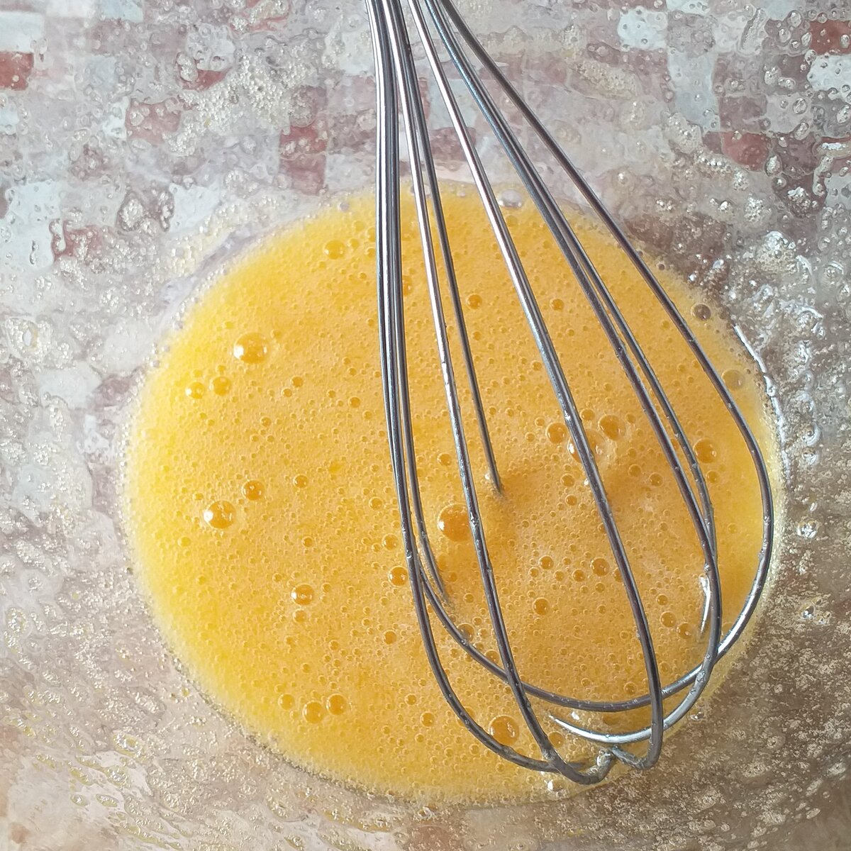 Сначала в глубокой миске совместить яйцо, сахар и щепотку соли. Хорошо взболтать смесь, затем влить комнатное молоко и тщательно перемешать венчиком до получения однородной консистенции.