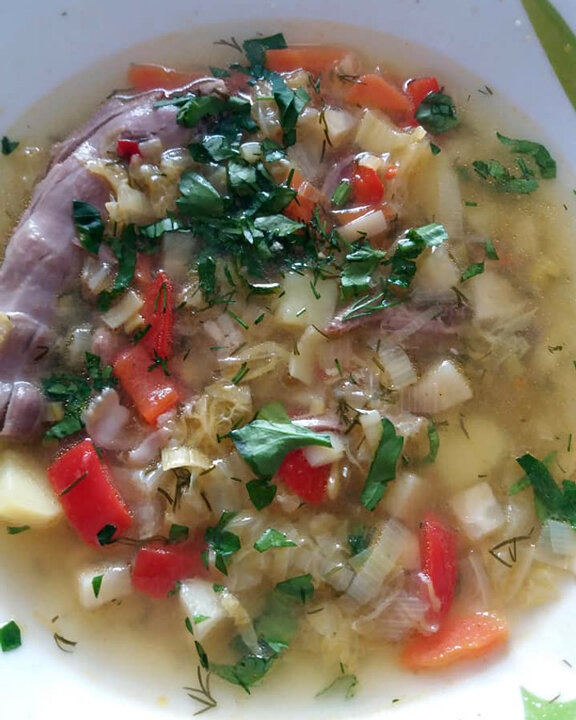 Подается такой суп лучше всего со свежей зеленью и ложкой сметаны. КБЖУ на 100 г составляет 27/3,0/0,8/1,8.