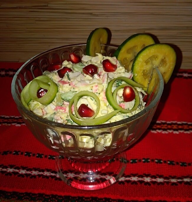 Приготовить салат можно всего за семь минут. Первым делом сыр стоит натереть на мелкой терке. Далее следует нарезать огурец и крабовые палочки кубиками и измельчить чеснок. Все ингредиенты объединяют в одной ёмкости, впоследствии добавляя майонез.