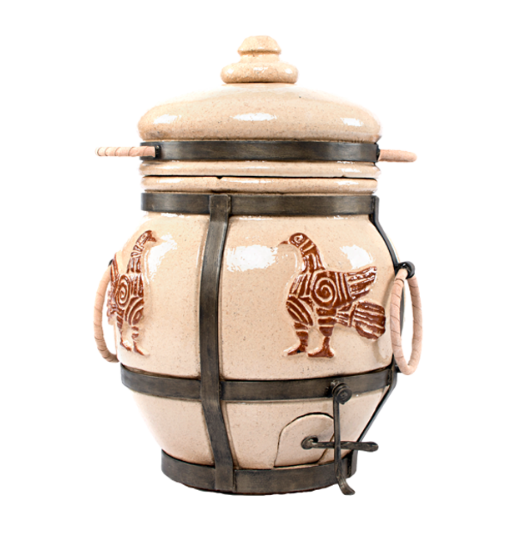 Изготовленный компанией «Эко», тандыр имеет стильный цвет «слоновая кость» с золотистым орнаментом. В комплект входят кочерга, крестовина для шампуров и совок для углей, а его прочность дополняют кованые полоски и ручки из натуральной кожи для удобного переноски.