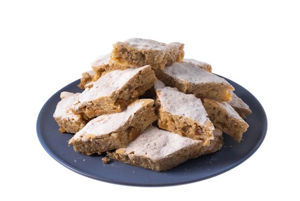 Сначала нужно промыть изюм и замочить его в коньяке на час, чтобы он хорошо пропитался.Орехи нарезать мелко, но не слишком измельчать. Это создаст приятную текстуру в печенье.Яйца следует тщательно взбить с сахаром и сливочным маслом, отложив немного масла для смазки противня.Затем объединить муку с крахмалом и добавить в яично-масляную смесь, тщательно перемешивая.Слить оставшуюся жидкость от коньяка, а затем аккуратно вмешать в тесто изюм и орехи.Подготовить противень: застелить его бумагой для выпечки или фольгой и смазать небольшим количеством масла. Вылить тесто, равномерно распределив его по поверхности.Выпекать при температуре 180–200 градусов в течение 15–20 минут, тщательно следя за выпечкой, чтобы она не подгорела. Проверить готовность можно зубочисткой.Готовое печенье нарезать по диагонали в двух направлениях, чтобы получились ромбики, и дать им остыть.Перед подачей посыпать романтическим слоем сахарной пудры.Соблюдая эти простые шаги, можно создать великолепное лакомство, которое станет хитом на любом празднике. Приятного аппетита!
