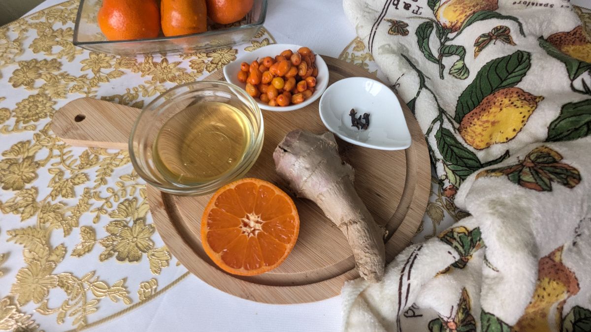 Имбирь следует очистить и нарезать мелко, а цитрусовые - порезать дольками. Облепиху, имбирь и цитрус следует немного потолочь в чайнике, добавить гвоздику и залить кипятком, но не кипящим (около 80 градусов). После этого мед добавляют по вкусу.