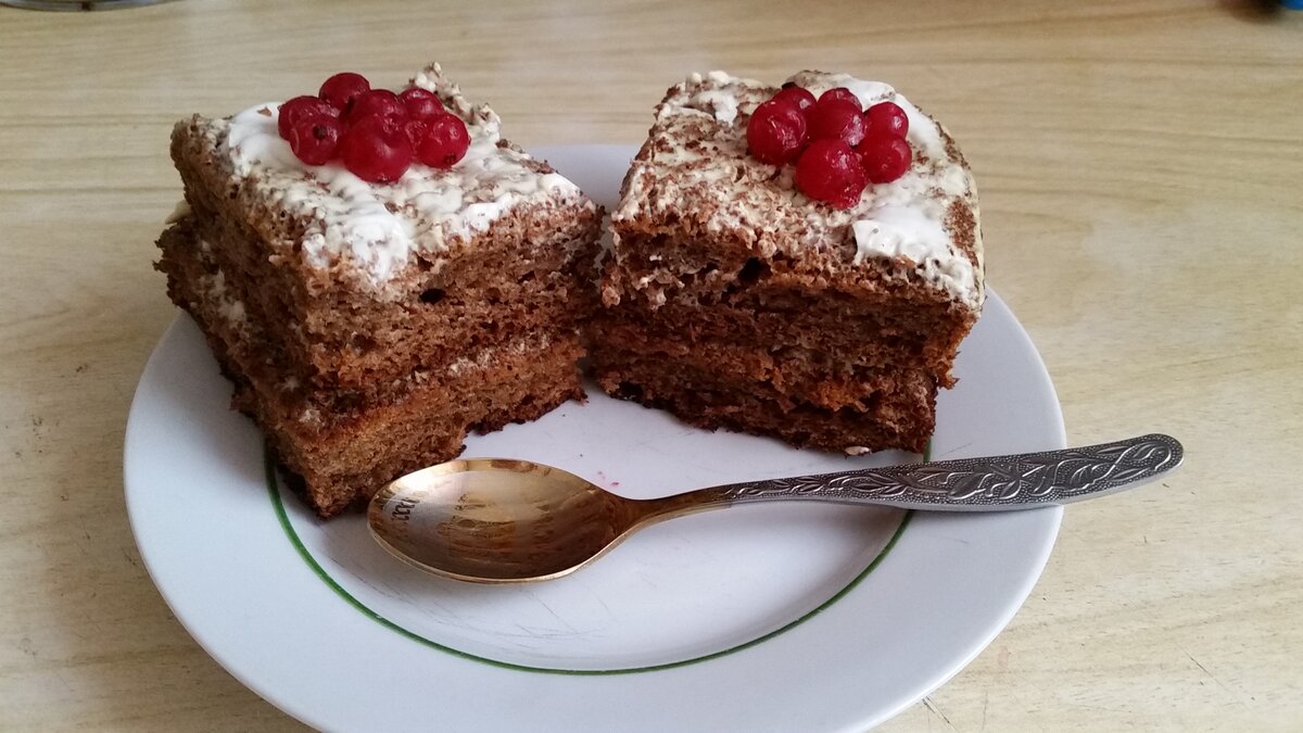 Для крема подойдет обычная сметана, взбитая с сахаром. Когда коржи немного остынут, их можно смазывать кремом с нижней стороны — это поможет ему лучше пропитаться. Ждать останется всего час, и ваш домашний торт будет готов к дегустации!