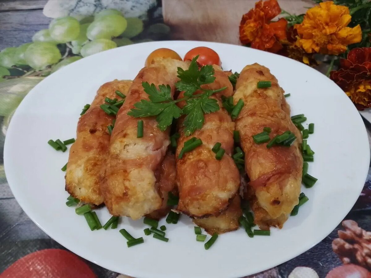 Запеченные мясные рулетики, обернутые хрустящим беконом, обещают стать настоящим хит-парадом на любом столе. Нежный куриный фарш, щедро приправленный специями, гармонично сочетается с ароматом и текстурой бекона, создавая блюдо, от которого невозможно отказаться.