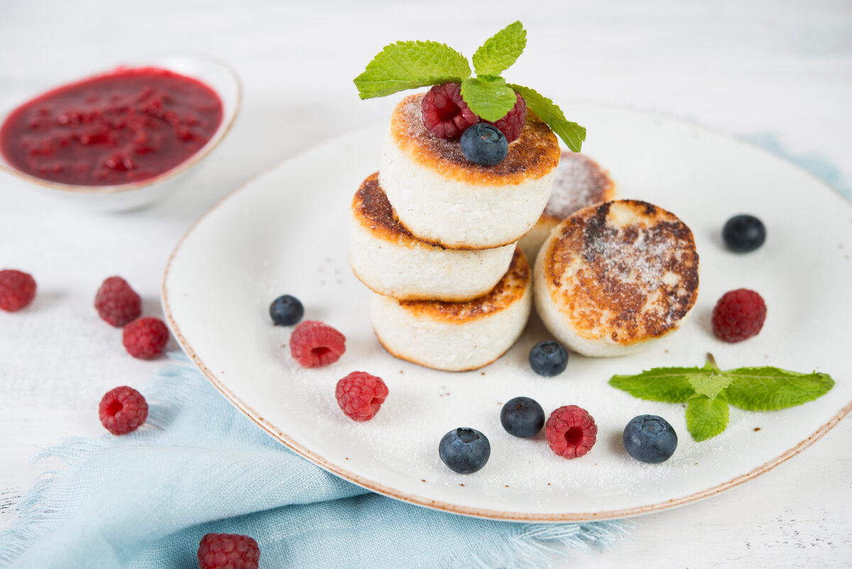 Сладкий завтрак: сырники с малиновым конфитюром и свежим фруктовым салатом
