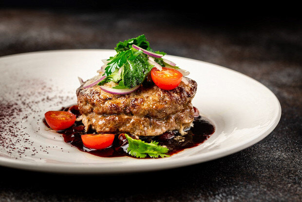 Говяжью грудинку пропускают через мясорубку, добавляют дижонскую горчицу, Вустерширский соус, 10 г соли и 3 г молотого перца. Сформируйте из полученной смеси котлеты весом по 300 граммов, придавая им плоскую форму.Разогрейте сковороду с оливковым маслом и обжарьте бифштексы с обеих сторон до появления золотистой корочки. Затем выложите их в противень, подсыпьте тертым пармезаном либо положите сверху ломтики горгонзолы и уберите в предварительно разогретую до 200 градусов духовку на 12 минут.Нарежьте помидоры черри дольками, смешайте с мелко нарезанной зеленью, посолите и заправьте оливковым маслом.Для соуса вишневое варенье разведите водой до консистенции, похожей на соус, добавьте немного свежемолотого перца и немного подогрейте.На дно тарелки вылите вишневый соус, установите бифштекс сверху и украсьте салатом из зелени с помидорами перед подачей.Этот аппетитный рецепт станет настоящим открытием для вашей кухни. Делитесь с друзьями и готовьте вместе с любовью!