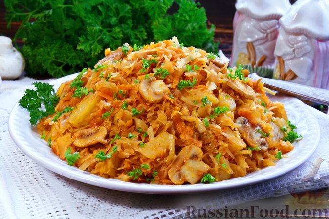 - Капуста с картошкой и грибами: простое, но сытное блюдо. В сочетании с обжаренным луком и морковью получается настоящий кулинарный шедевр.