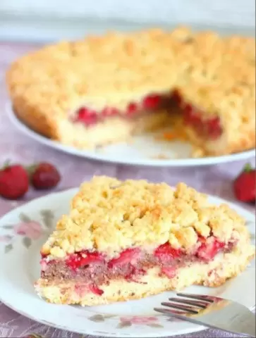 На тесто ровным слоем выложить творожную начинку и клубнику. Сверху посыпать оставшейся крошкой.