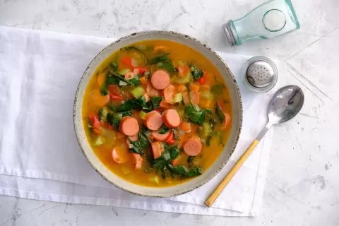 Этот овощной суп может легко стать вегетарианским, если использовать постные сосиски, которые предлагает Микояновский мясокомбинат. Эти сосиски готовятся исключительно из растительных ингредиентов, что делает их отличной альтернативой для тех, кто следит за своим питанием. Оригинальный вкус придает блюду сочетание красного и зеленого перца, что позволяет сделать суп не только полезным, но и очень аппетитным.