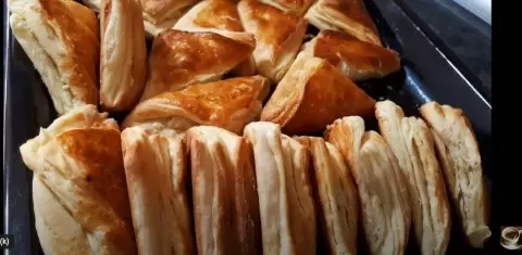 Теперь раскатайте всю конструкцию до толщины около 0,5 см и нарежьте на квадраты. В середину каждого квадрата поместите столовую ложку начинки, сложите квадрат по диагонали, формируя треугольник. Смажьте поверхность взбитым яйцом и оставьте заготовки на 10 минут. Затем отправьте их в предварительно разогретую до 180 градусов духовку на 20-25 минут. Время выпекания может немного варьироваться в зависимости от вашей духовки.