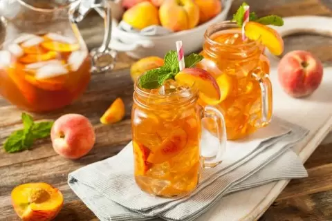 Перед тем как подавать, добавьте в остуженный чай лимонный сок и перемешайте. Затем положите нарезанные персики, кубики льда и немного свежей мяты. При желании, посластите напиток сахаром. Хорошо перемешайте компоненты.
