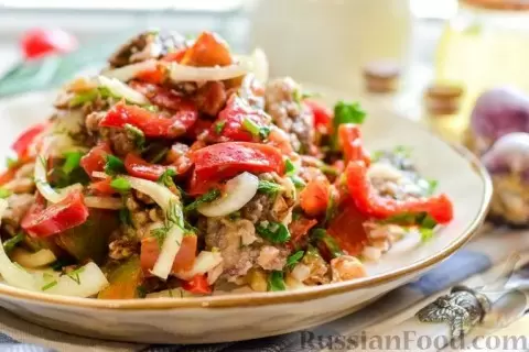 - Салат с печенью и орехами: Жареная куриная печень в сочетании со сладким перцем, помидорами и грецкими орехами делает этот салат настоящим кулинарным шедевром — идеально подходит для полноценного ужина.