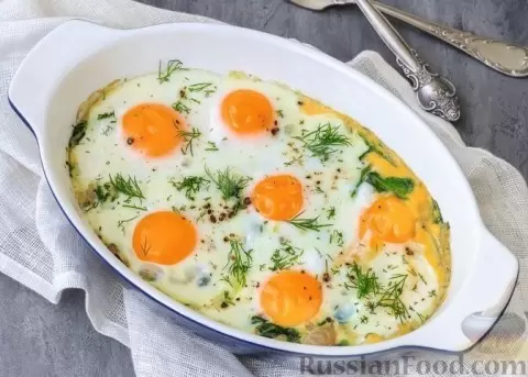 - Запечённая яичница с луком и шпинатом: Невероятное сочетание шпината и репчатого лука, которые обжариваются и запекаются с яйцами. Это прекрасно подходящее блюдо для простого, но вкусного завтрака.