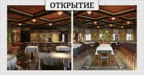 Что же нас ждет внутри? Судя по рендеру, заведение оформлено в светлых тонах с белыми скатертями и приглушенным теплым светом. Глядя на фото, можно заметить основательную барную стойку и открытые кухни с массивным грилем, где мясо будет подвешено специально для приготовления.