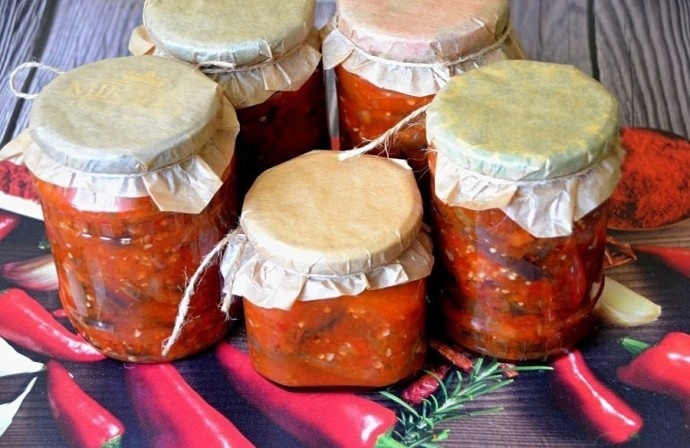 Разложите закуску по предварительно стерилизованным банкам в горячем виде, плотно закройте крышками и укройте одеялом для остывания.