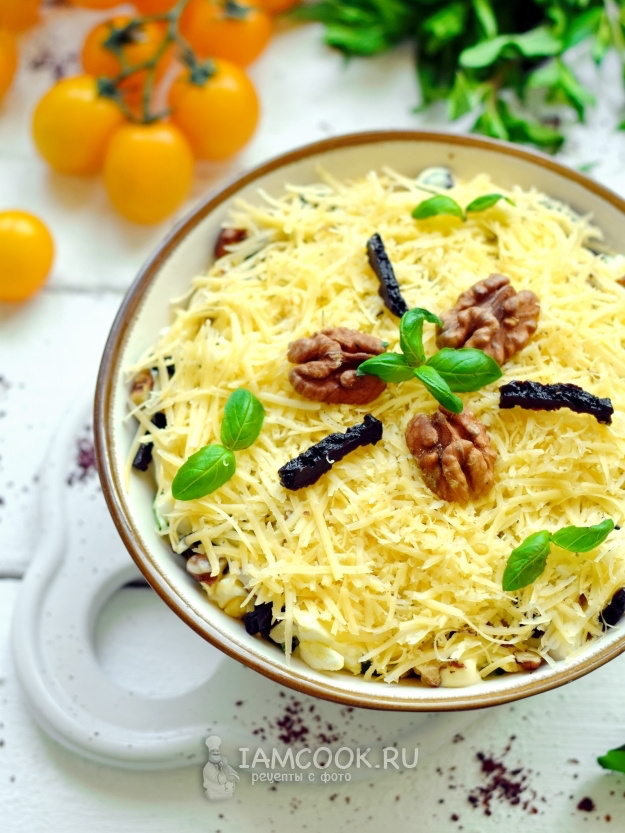 Последним слоем станет натертый сыр, который не следует смазывать майонезом. Дайте салату настояться в холодильнике хотя бы час — так все слои пропитаются и вкус станет завершённым. Перед подачей украсьте салат черносливом, орехами или свежей зеленью по желанию.